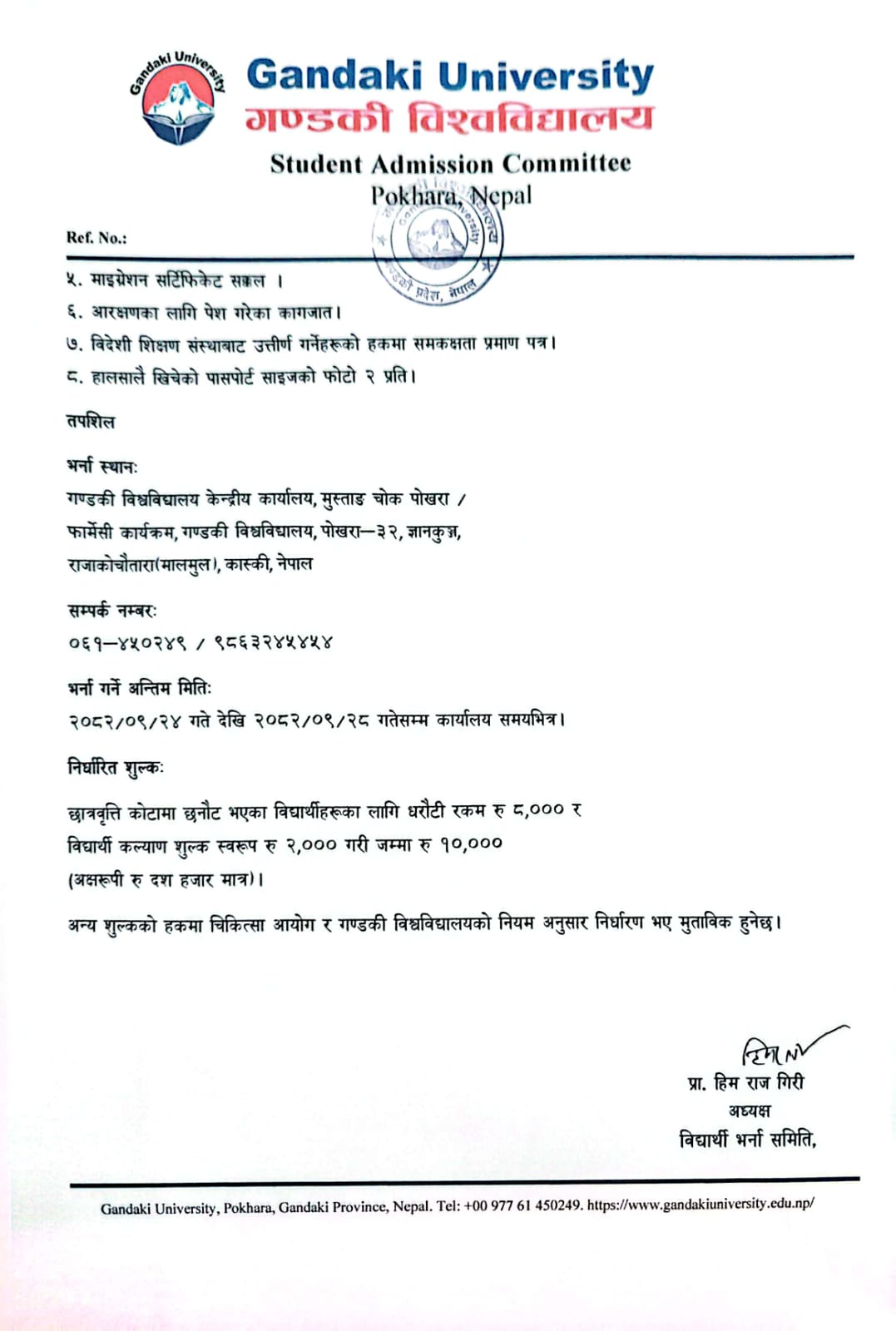 सूचना एवम् कार्यविधि सम्बन्धी विस्तृत जानकारी गण्डकी विश्वविद्यालयको वेवसाइट https://www.gandakiuniversity.edu.np बाट प्राप्त गर्न सकिनेछ।