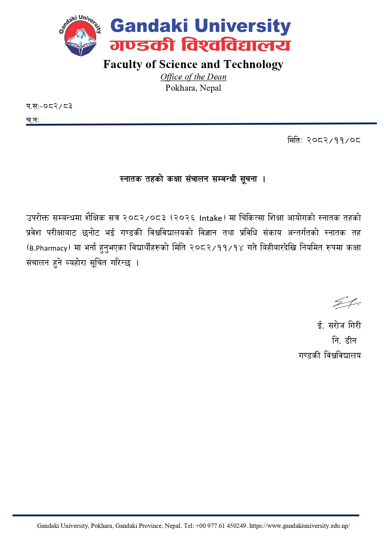 स्नातक तहको कक्षा संचालन सम्बन्धी सूचना (B.Pharm)